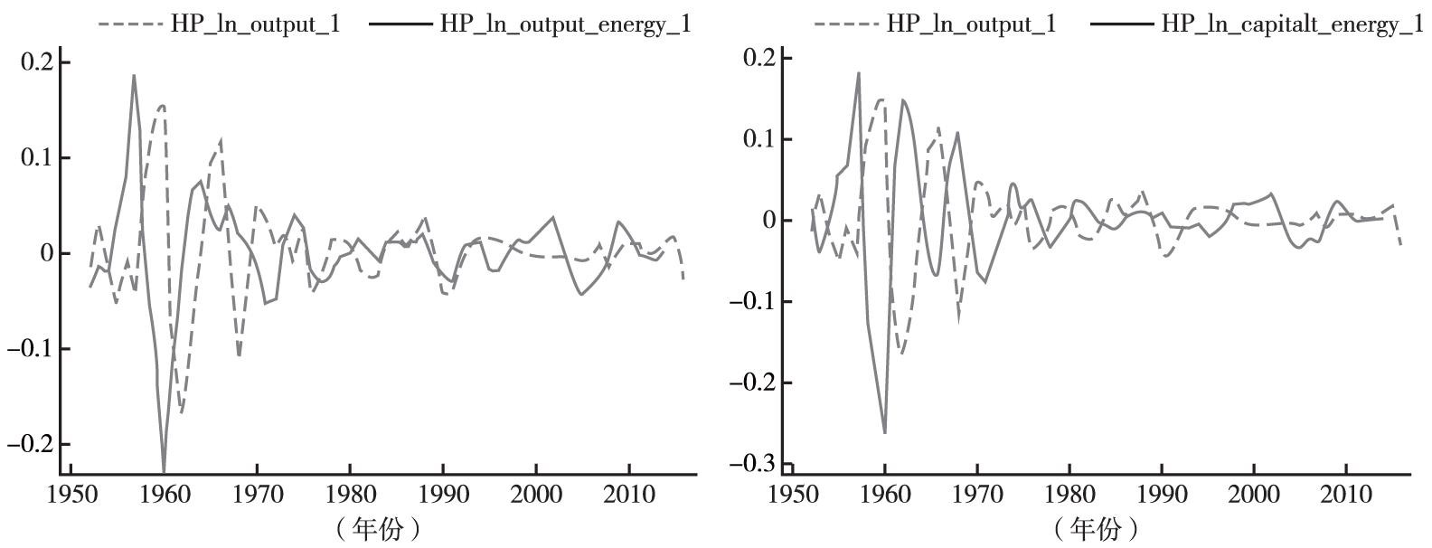 此外,1952—2015年和1978—2015年,产出、能源消费、能源效率实际波动的主要统计指标表现出三方面特征(见表1)。一是波动性,改革开放之后产出、能源消费、能源效率波动的标准差都变小了。其中,能源消费的波动幅度要大于产出,而能源效率的波动幅度与产出比较接近。二是对称性,能源消费则表现为明显的向上偏倚,能源效率则正好相反,向下偏离明显,尤其是资本-能源效率更为明显。三是相关性,从资本-能源效率与产出当期负的相关系数可知,资本-能源效率表现出较强逆周期的特征,产出-能源效率与产出的当期相关系数在改革开放前后发生了微弱的正负变化,改革开放之后基本上是温和顺周期。