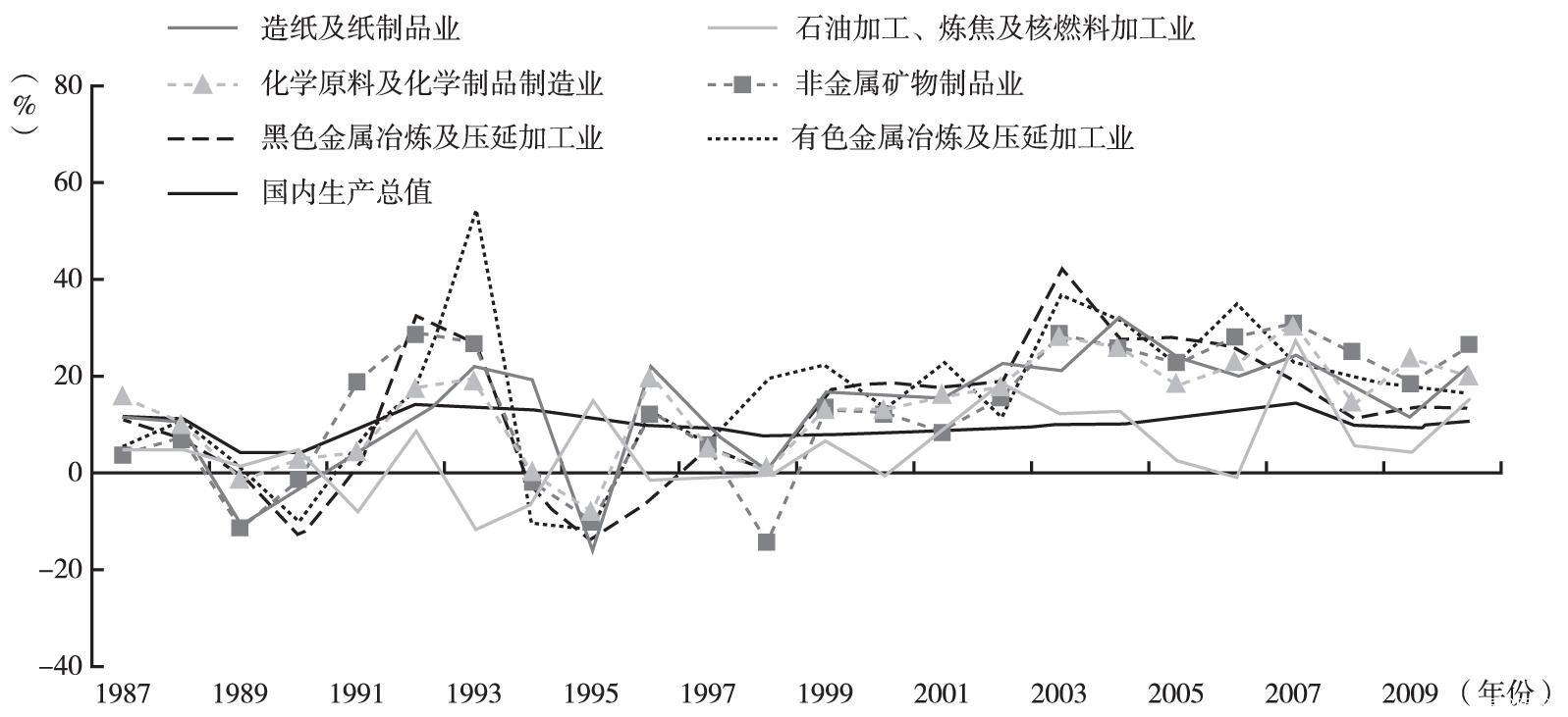 图8 六大高耗能产业与国内生产总值的增长率变化