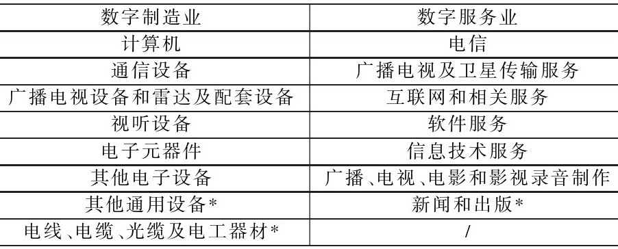注:此处的行业名称与国家统计局公布的2017年中国竞争型投入产出表一致;带“*”的行业,由于其细分行业中大部分属于《数字经济及其核心产业统计分类(2021)》中的数字产业化范畴,为了便于处理,本文直接将这些大类行业直接划归为数字产业。