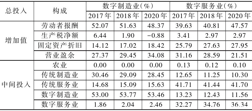 表3 中国数字产业内部细分行业增加值和中间投入的构成