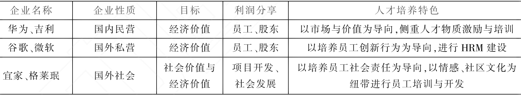通过总结国内外知名企业的人才培养模式可知,他们在人才队伍建设方面各具特色(见表3),为我国人才强国战略下国企人才队伍建设提供了经验。一是市场化导向的选人、用人及育人的HRM管理实践,形成了人才培育的良性循环。国内外许多知名企业依据市场规律,制定人才选聘标准,采用公开选拔、竞争上岗、“能者上庸者下”等透明招聘程序,进行人才的筛选与选拔,防止“内部繁殖”带来的弊端;基于劳动力市场规律进行薪酬体系建设,以市场价值和岗位贡献为导向对人才进行评价,且普遍薪酬水平高于市场水平,增强物质激励效应;视人才为最重要的资本,大力度进行人力资源的培训与开发,提高员工技能,满足人才成长需要。二是基于法律法规、契约精神及现代人力资源管理理论,实行市场化、契约化的劳动雇佣关系管理,摒弃了由于“身份管理”造成的员工不平等现象,真正实现了“岗位管理”下的“同工同酬”,保证了职业发展通道的贯通性,有利于增强人才的身份认同感和公平感。三是鼓励人才创新,从制度和文化层面构建激励人才创新的双重机制。