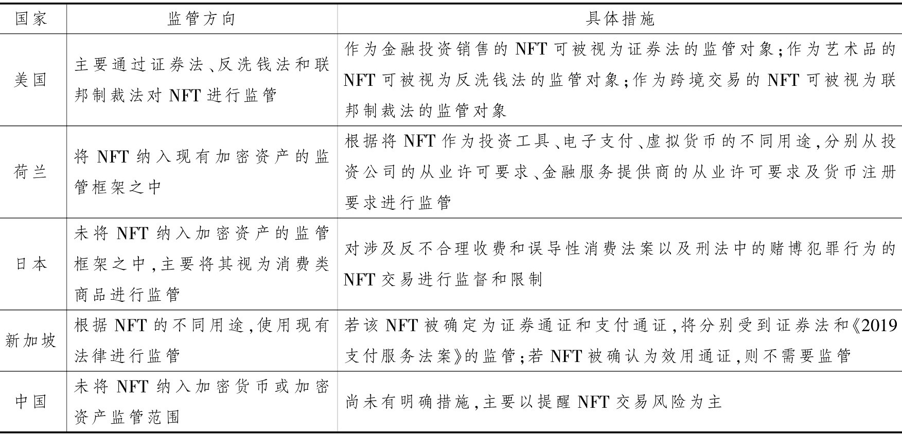 以荷兰为代表的欧盟国家,当前对NFT的监管措施主要是将其纳入现有加密资产监督框架之中。根据荷兰的反洗钱法,加密资产被定义为以分布式账本技术存储或交易的一种契约权利,作为加密资产的NFT会受到以下监管:首先,如果某类NFT可作为金融机构的投资工具(如作为一种股票、债券或其他金融衍生品),那么与其有关的买卖、中介和其他辅助服务可能会触发金融投资企业的从业许可要求;其次,如果某类NFT符合电子支付的条件,代表发行人赋予的一种电子消费能力,那么发行人可能会触发电子支付机构的从业许可要求;再次,如果某类NFT可被视为一种投资对象,那么就该NFT进行的发售或中介行为将可能会触发金融服务提供商的从业许可要求;最后,如果某类NFT可被视为一种虚拟货币,即使不附属于合法设立的货币,不具有货币或金钱的法律地位,但如果被市场主体作为交换手段,并通过电子方式传输、存储和交易,那么该NFT将会触发荷兰的货币注册要求。