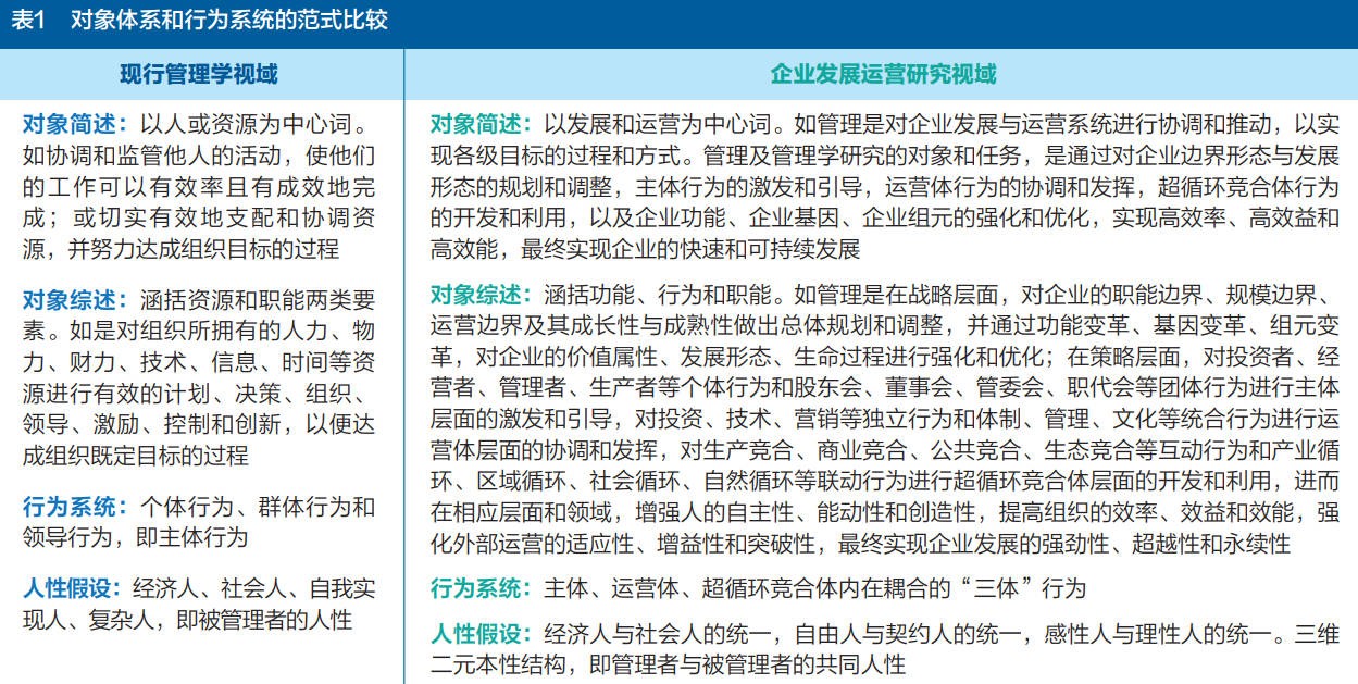 由表1可见,现行管理和管理学的概念与架构,存在简化实际对象和关系结构的三大缺陷:一是未能涵括管理对象的整体形态与全部领域;二是未能揭示人的行为与企业行为之间的演化过程与演化机制;三是未能反映内部系统与外部系统功能耦合的目标与层次。而企业发展运营研究的对象体系,则呈现为一种“和合万象”“统揽全局”的行为空间,不仅涵括了初始性的“主体行为”,还涵括了耦合性的“运营体行为”、源泉性的“超循环竞合体行为”及演进性的“边界与变革”行为。