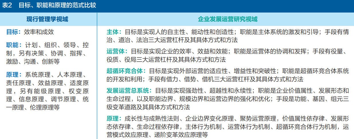 由表2可见,传统管理的目标、职能和原理,简明扼要,但缺乏体系性包容和内在性生成,特别是管理目标缺乏与使命和愿景、职能和策略之间的结构性和机制性关联。而企业发展运营研究视域的目标、职能及其杠杆和原理体系,则有着清晰的因果反馈网络关系与全局视野,有着明确的对象与载体。特别是“运营杠杆”的引入,承上启下,实现了职能、手段与方式的内在统一。