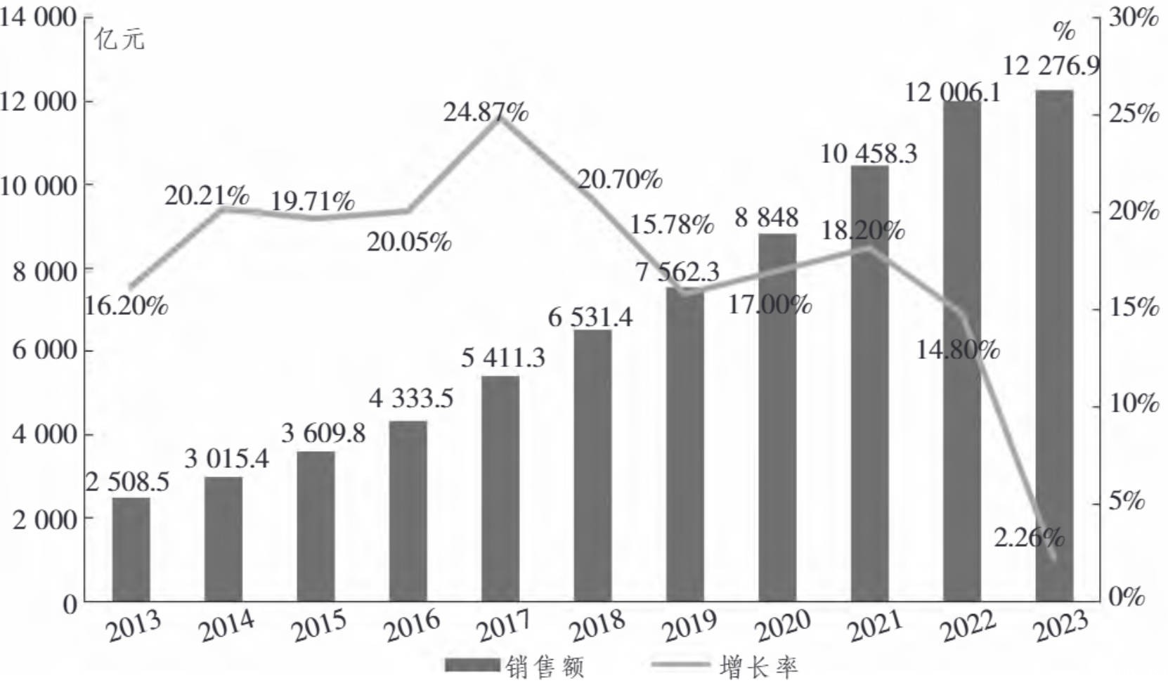 销售额预计2030年将突破2.4万亿元,在国民经济中的支柱性和基础性地位进一步强化。集成电路产业是中国增速最快的产业之一,中国半导体行业协会的数据显示,2023年中国集成电路产业销售额为12 276.9亿元(见图3),2013—2023年复合增长率达到17.21%。尽管2022—2023年国内市场销售额增速有所下滑,但在人工智能、智能制造、智能算力等需求快速增长的背景下,预计未来依然会高于全球增速(ASML预测2023—2030年全球复合增长率为9.12%),以10%~15%的增速计算,预计2030年中国集成电路销售额将达到2.4万~2.5万亿元。