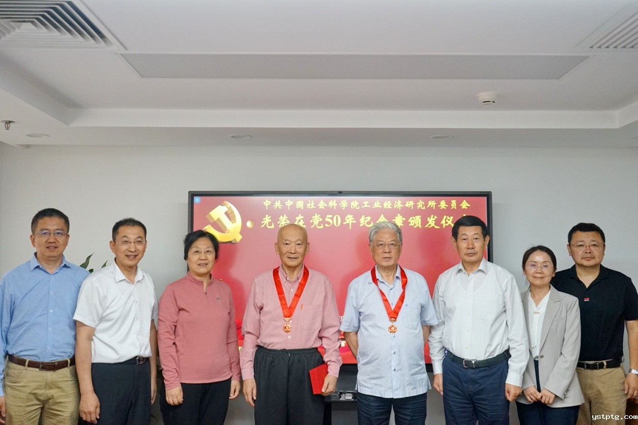 工业经济研究所党委书记曲永义、所长史丹为离退休老党员金碚、纪坡民颁发“光荣在党50年”纪念章